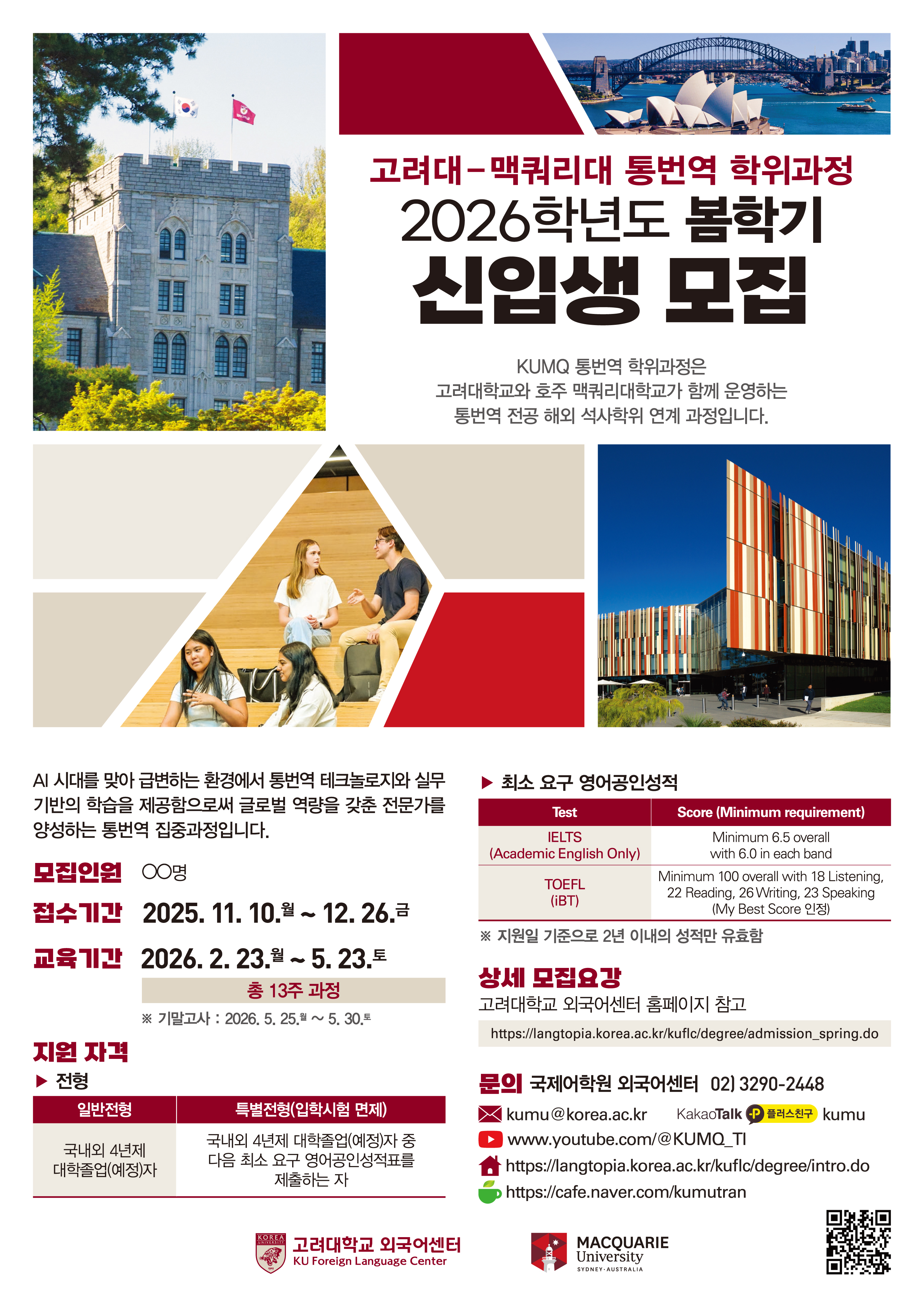● 2026학년도 봄학기 고려대-맥쿼리대 통번역 학위과정 모집공지 및 안내브로셔 첨부파일 참조하세요. ● 「고려대-맥쿼리대 통번역 학위과정 」 2026학년도 봄학기 신입생 모집공지 https://langtopia.korea.ac.kr/kuflc/degree/admission_spring.do